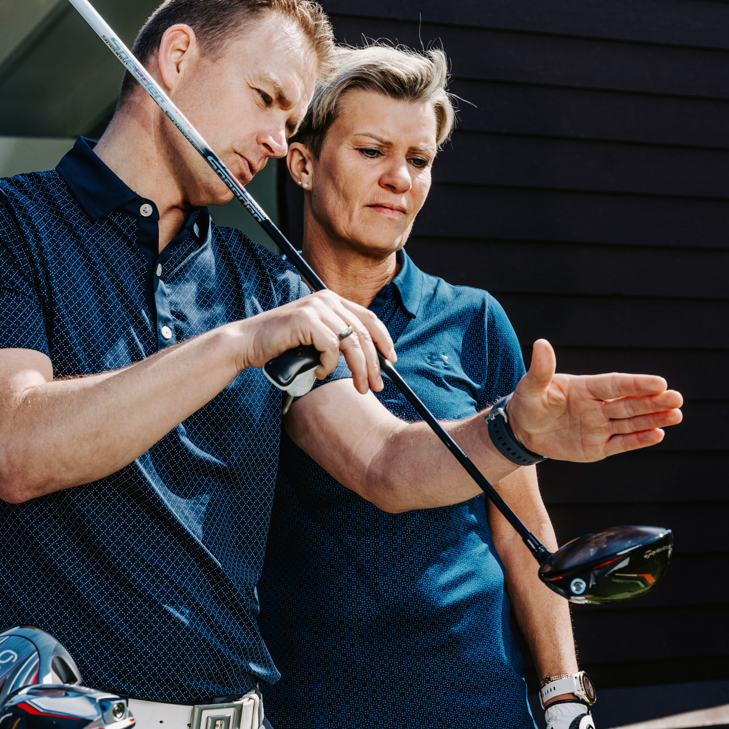 – Selv om jeg godt ved, at mange af de tekniske termer ikke siger dig så meget Lenette, så synes jeg det er vigtigt, at du finder et køllehoved, som du kan lide at kigge ned på, siger René. Noget der giver dig selvtillid, når du står over bolden.