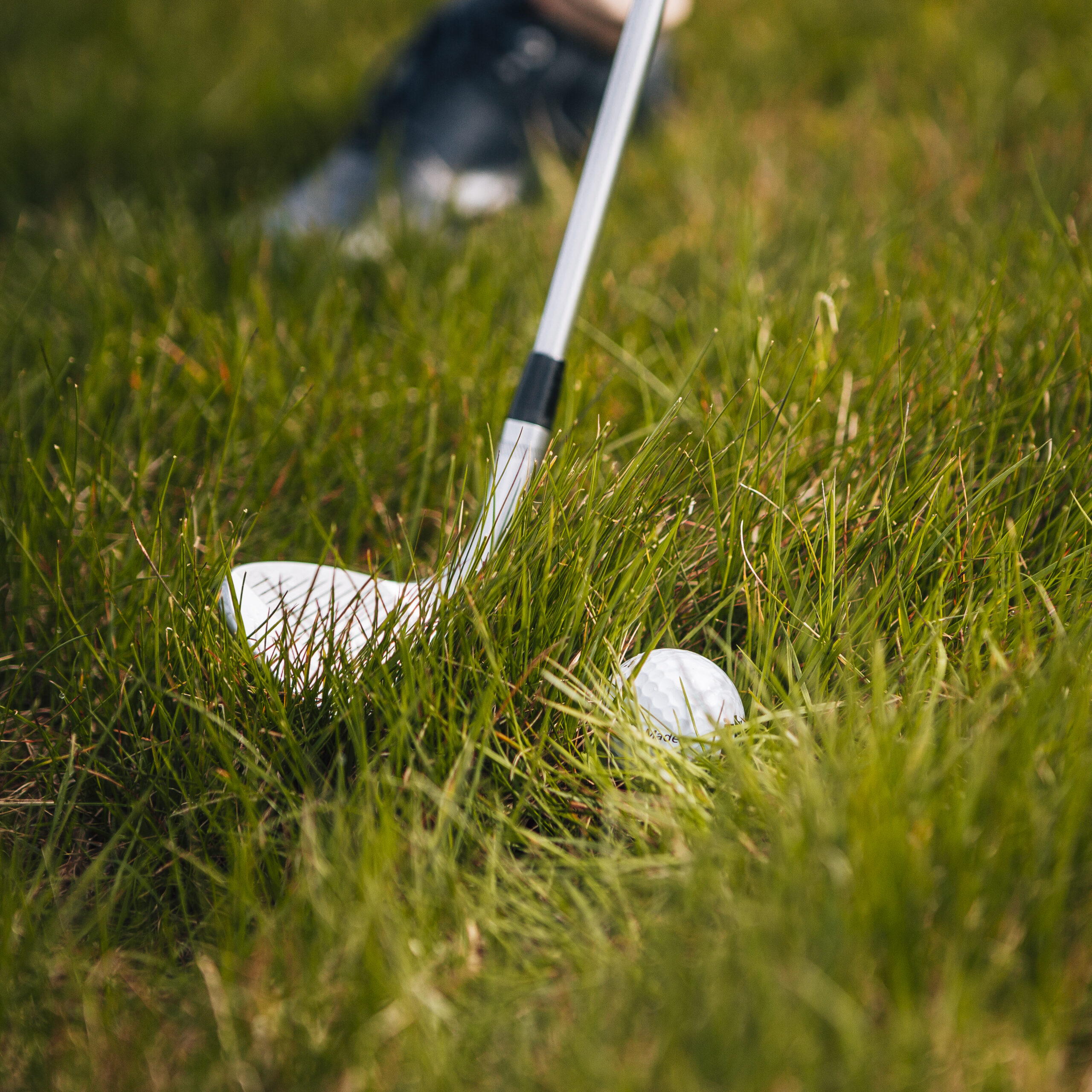 Når bolden ligger udfordrende, måske generelt dårligt i den tykke rough, er det ekstra vigtigt at tænke positivt. Men der findes også direkte værktøjer, som kan redde dig fra en katastrofal score på det aktuelle hul. Læg bolden bag den højre sko, og vælg den kølle i baggen, der har det højeste loft. På den måde bliver køllens indfaldsvinkel stejl, og du hugger ned på bolden. Den bedste effekt får du, hvis hænderne vinkles mod indersiden af venstre lår. Så vil køllen i større udstrækning ”angribe jorden”, hvilket er en forudsætning, hvis bolden ligger dårligt.