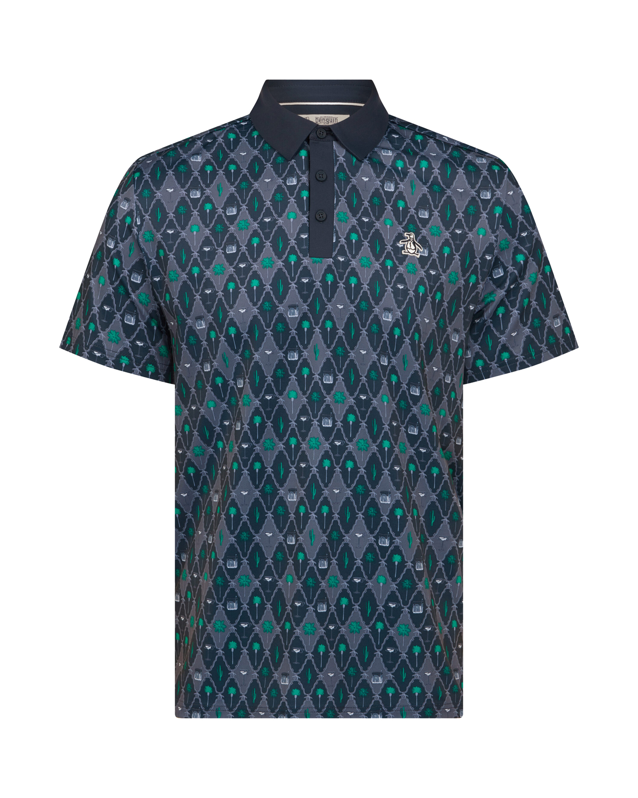 Denne Original Penguin golfpoloshirt til mænd er designet af genbrugsmateriale og er et bæredygtigt valg. Det lette, enkeltstrikkede stof har stretch for komfort og smidig bevægelse og transporterer også fugt væk for en kølig og tør fornemmelse. Golfskjorten er forsynet med et lettice cocktailprint, som giver dit golftøj et finurligt og stilfuldt touch.